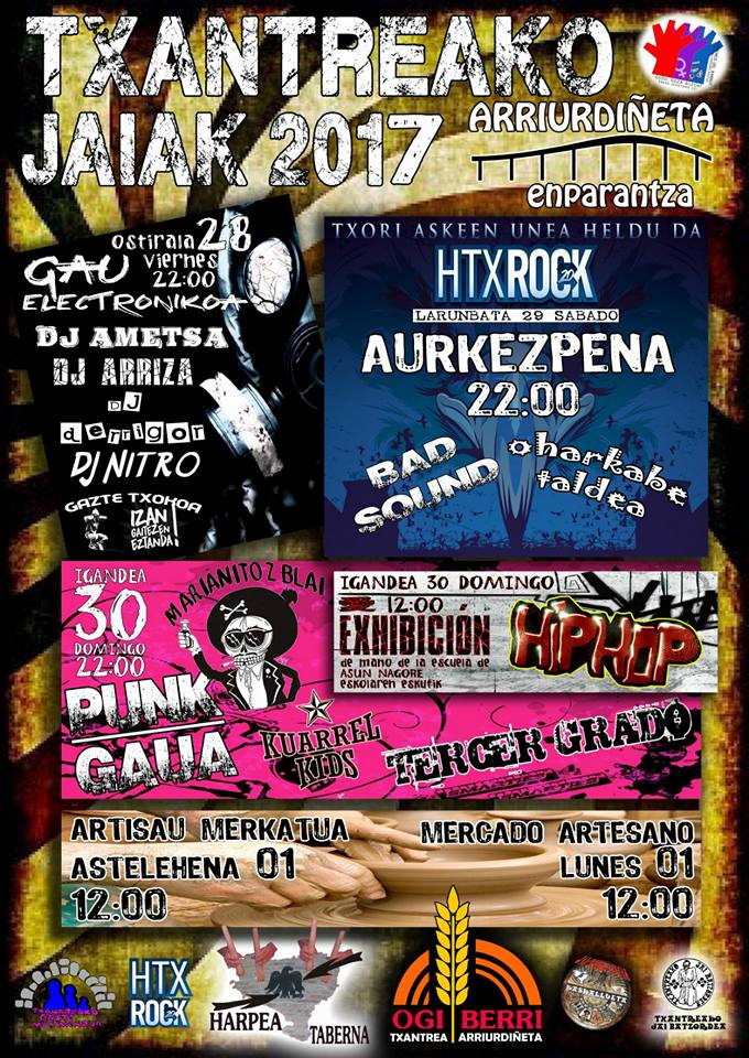 Bost egunez izanen dute festa giroa Txantrean. Suziria lehertu bezain pronto, dantzari ekinen diote eta, ostean, preso, iheslari eta errefuxiatuen eskubideen aldeko topa eginen dute. Gauean, musikaren txanda iritsiko da. Gazteek, gainera, afaria izanen dute, Herri parkean. Ez hori bakarrik, gainontzeko egunetan, egitaraua leporaraino betea egonen da.