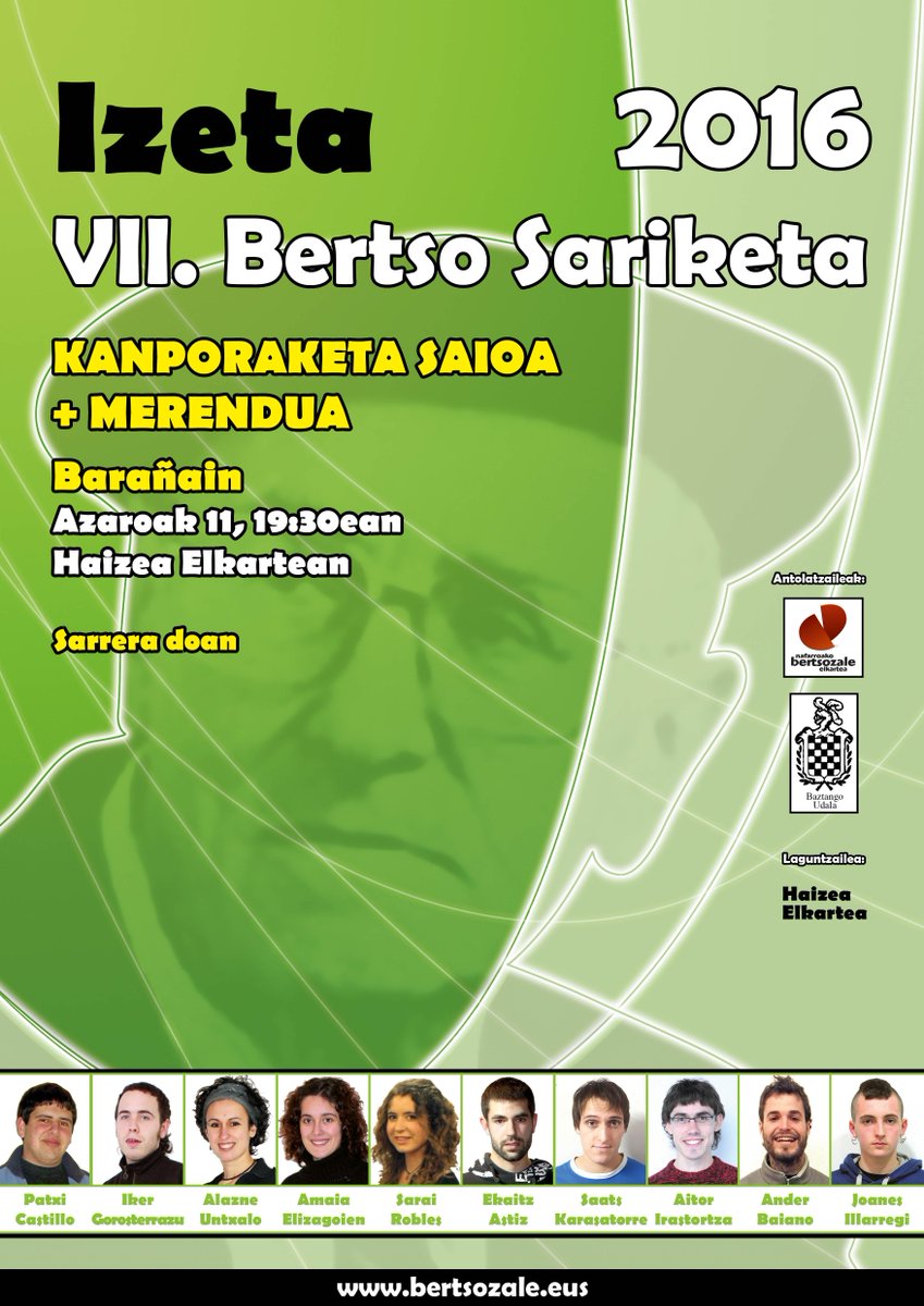 Hamar bertsolari igoko dira oholtzara, bihar, Patxi Castillo (Bera), Iker Gorosterrazu (Ituren), Amaia Elizagoien (Oronoz), Sarai Robles (Barañain), Alazne Untxalo (Ituren), Ekaitz Astiz (Iraizotz), Saats Karasatorre (Etxarri-Aranatz), Aitor Irastortza (Azpirotz), Joanes Illarregi (Leitza) eta Ander Baiano (Barañain). Horietatik lau baino ez dira pasako hilaren 18an Elizondon jokatuko den finalera.