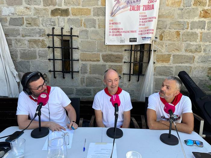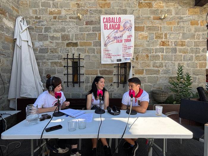 Peñen Federazioko presidente Rakel Arjol eta Muthiko Alaiak peñako presidente Ander Zamora gerturatu dira Zaldi Zurira. Peña bateko kide izateaz eta peñek jaietan duten paperaz mintzatu dira.