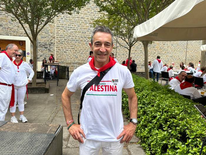 "Iruindarrak, gora sanfermin! Stop genocide! Free Palestine!" hitzekin piztu zuen atzo suziria Yala Nafarroak. Palestinaren aldeko txupinazoak eman zien atzo hasiera jaiei eta balkoiko protagonistetako batek, Eduardo Iberok, azaldu digu. Lidon Soriano, Edu Ibero eta Dyna Kharrat izan ziren udaletxeko balkoian.