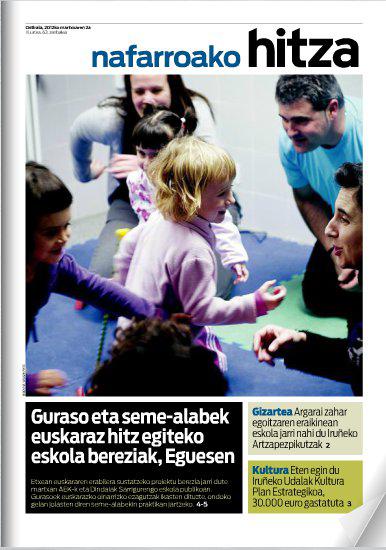Etxean euskararen erabilera sustatzeko egitasmo berezia jarri dute martxan AEK-k eta Dindaian, Sarrigurengo eskola publikoan. Gurasoek euskarazko oinarrizko ezagutzak ikasten dituzte, ondoko gelan jolasten diren seme-alabekin praktikan jartzeko. Egitasmo horri buruzkoa da Nafarroako Hitza gehigarriaren aste honetako erreportaje nagusia. Bestalde, Argarai zahar egoitzan eskola jarri nahi du Iruñeko Artzapezpikutzak. Asmo horrek polemika handi samarra eragin du, eta horri buruzko informazioa ere aurki daiteke Berriaren gehigarri nafarreko azken alean. Jorratzen duen beste gai bat, Iruñeko Plan Estrategikoa, edo haren gabezia; izan ere, Udalak hori egiteko asmoa bertan behera utzi du, 30.000 euro gastatu eta gero. Aste honetan, iritzi-emaile, Ion Orzaiz. Bere zutabearen izenburu iradokitzailea, "Ezkertiarra izatea gorroto dut".