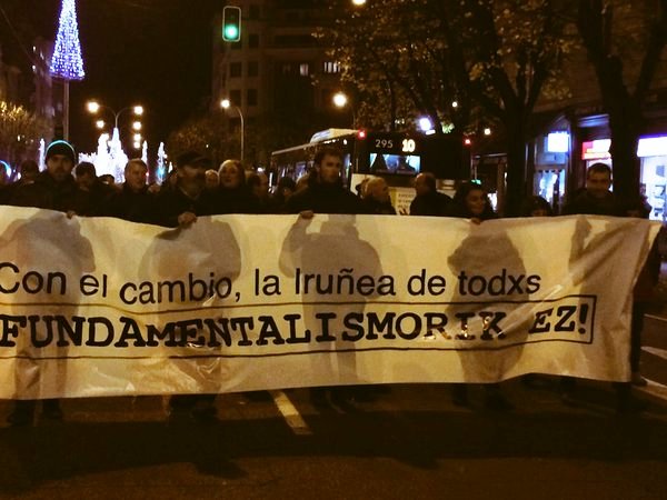 Ehunka lagun bildu ziren Aldaketaren alde, guztion Iruñea. Fundamentalismorik ez zioen pankartaren atzean atzo Iruñeko autobus geltoki zaharrean, fundamentalismoa errefusatzeko eta aldaketaren aldeko apustua berresteko.