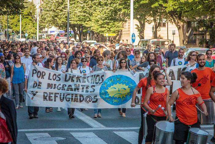 Mobilizazio jendetsua osatu zuten atzo Iruñeko kaleetan, Migratzaile eta errefuxiatuen eskubideen alde lelopean EBko estatuek errefuxiatuei harrera egin diezaieten exijitzeko.
