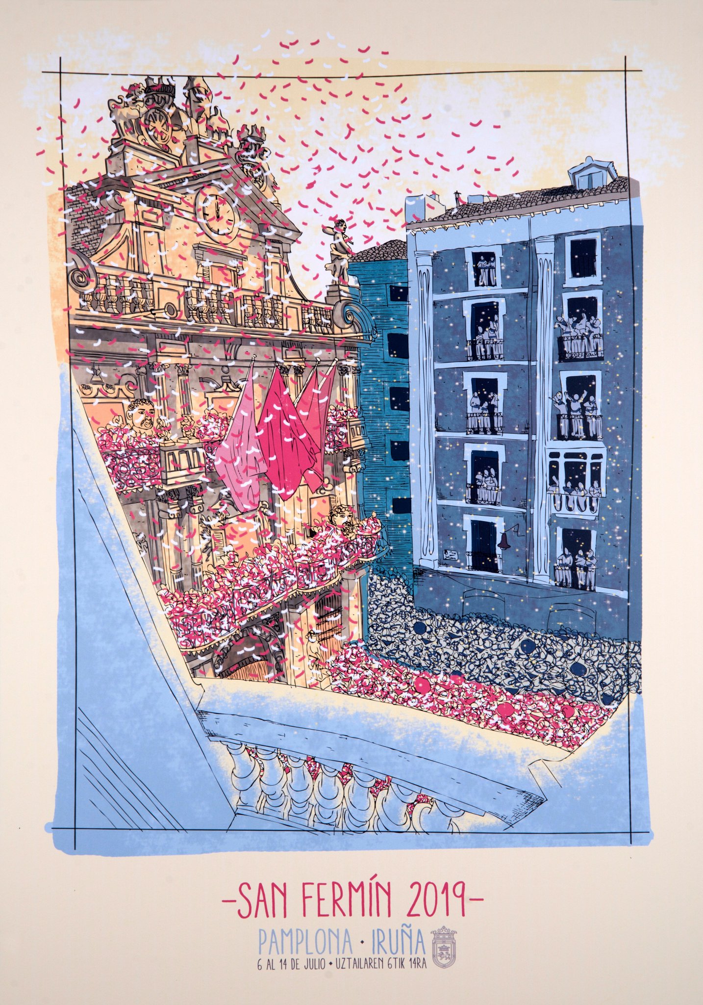 Sanferminetako kartela diseinatzen duen seigarren emakumea da Edurne Tainta. 24 urte ditu, eta garaipena barneratzen ari dela adierazi du udaletxean batu diren hamarnaka hedabideen aurrean. Politikarik gabeko afixa egin nahi izan du, eta bandera neutroak ezarri ditu udaletxeko balkoian.