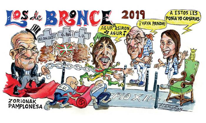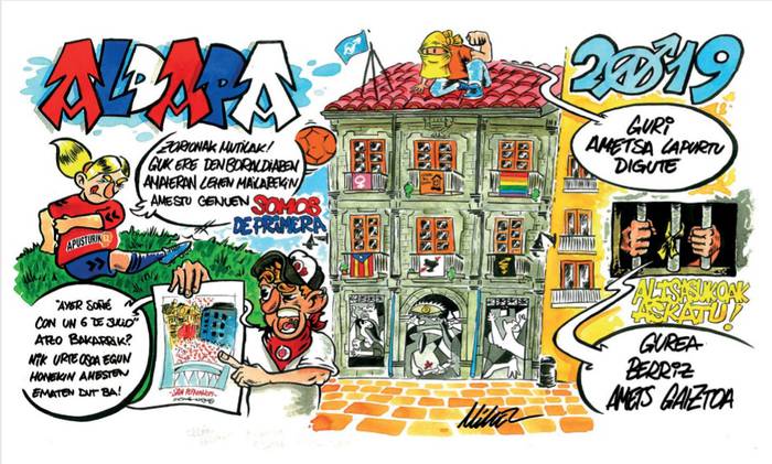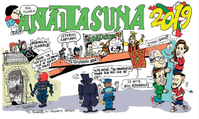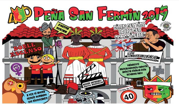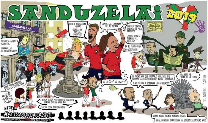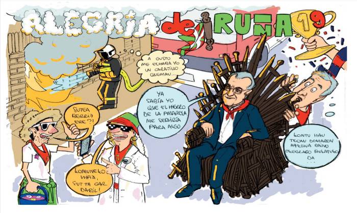 - Jantzia: zuria eta gorria. Txikiek brusa ere bai, koadro zuri eta urdinekin