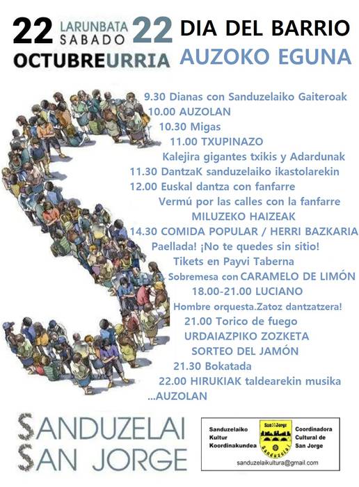 Sanduzelai auzoko eguna. Txupinazoa, kalejira, dantza, herri bazkaria, Lucianoren musika, suzko zezena, zozketak eta askoz gehiago.