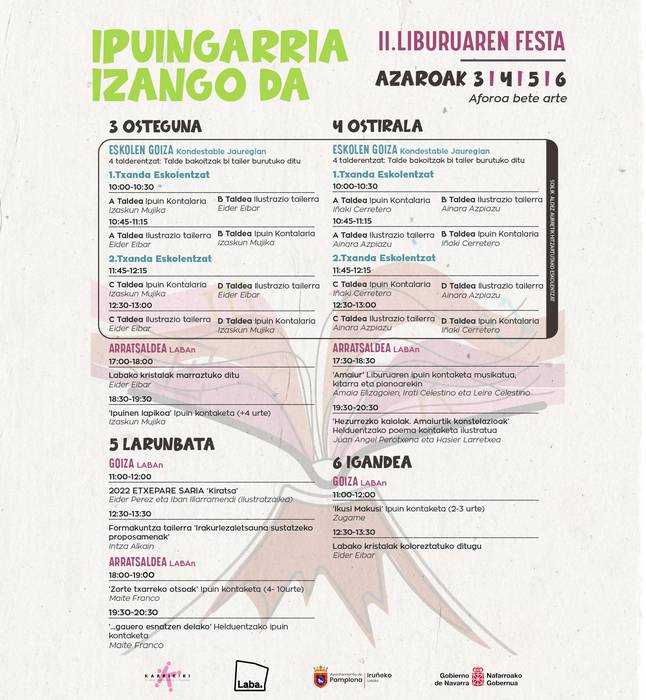 'Ipuingarria izango da', II. Liburuaren Festa Karrikiri eta Labaren eskutik. Azaroaren 3tik 6ra, eskolentzat antolatutako jarduerak eta arratsaldetan zein asteburutan haur eta helduentzako ipuinak, hitzaldiak, formakuntzak...