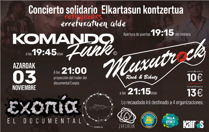 Exopia dokumentalak kontzertu solidarioa antolatu du Grezian harrapatuta dauden errefuxiatuen alde. Bildutako diru guztia Lesbosen eta Atenasen nazioarteko babesa eskatzen duten pertsonekin lan egiten duten eta errefuxiatu-esparruetan bizi diren 4 GKErentzat izango da.