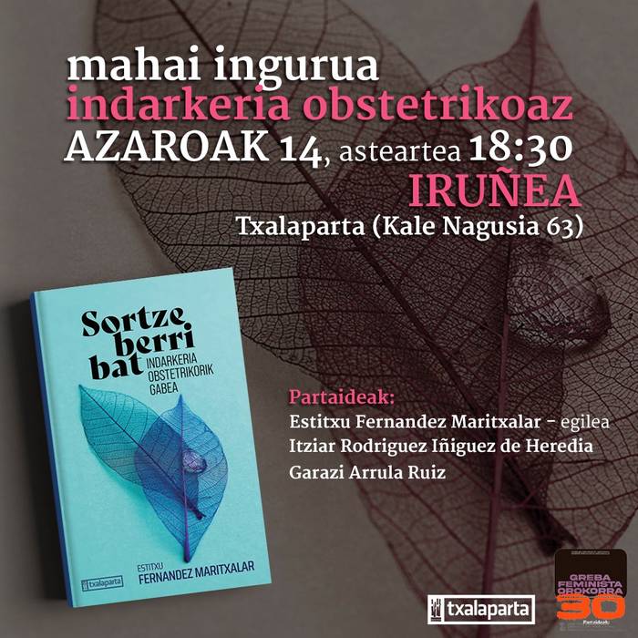 Sortze berri bat Estitxu Fernandezen liburutik abiatuta, indarkeria obstetrikoari buruzko mahai ingurua antolatu du Txalapartak, arratsaldeko 18:30ean, Kale Nagusiko egoitzan. Parte-hartzaileak Estitxu Fernandez Maritxalar (egilea), Itziar Rodriguez Iñiguez de Heredia eta Garazi Arrula Ruiz editorea izango dira.