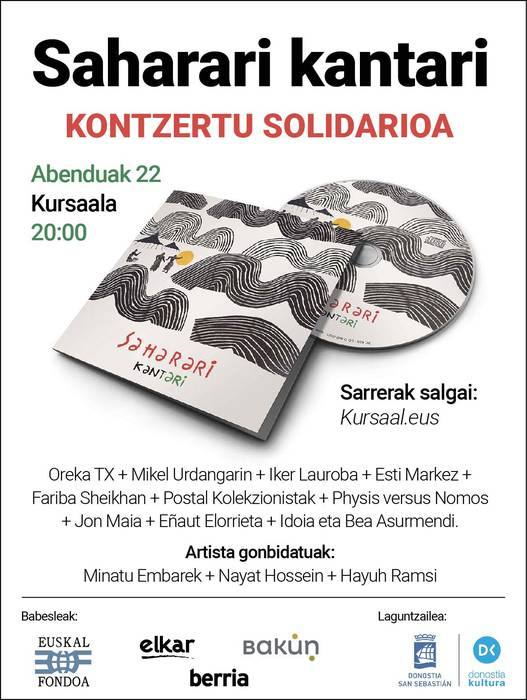 Saharari kantari kontzertu solidarioa egingo dute Kursaal aretoan, arratsaldeko 20:00etan. Hauek dira kontzertuan oholtzara igoko diren musikariak: Oreka Tx, Mikel Urdangarin, Iker Lauroba, Esti Markez, Fariba Sheikhan, Postal Kolekzionistak, Physis versus Nomos, Jon Maia, Eñaut Elorrieta eta Idoia eta Bea Asurmendi. Gainera, hiru artista gonbidatu egongo dira: Minatu Embarek, Nayat Hossein eta Hayuh Ramsi.