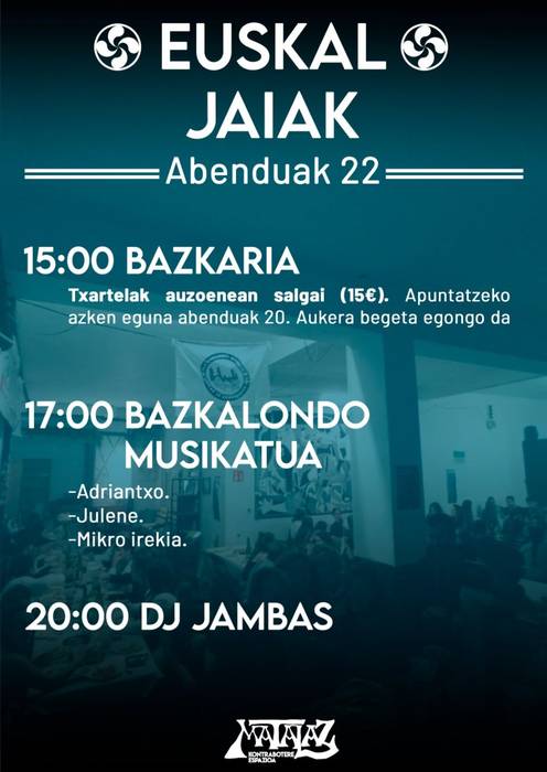 Bazkaria eta bazkalondo musikatua antolatu du Matalazek euskal jaia ospatzeko; Adriantxo eta Juleneren eskutik eta mikro irekia. Eta 20:00etatik aurrera DJ Jambas.