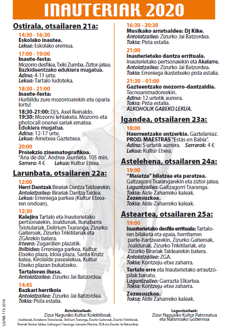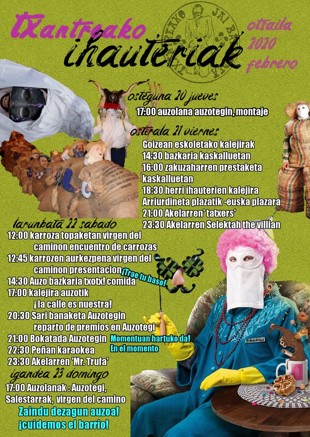 - 18:00-20:00 Ihauteriari hasiera emateko pregoia Txokogorrin. Ostean, Eguzki Eder Dantza taldea, aurpegi margoketa, Ezkaba ikastetxeko ikasleek egindako marrazkien aurkezpena eta auzokideen emarien esker meredua.