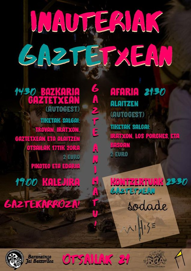 Gazteen inauteriak Gaztetxean izango du erdigunea. Otsailaren 21an, 14:30etatik aurrera, bazkari autogestionatua egingo da Gaztetxean. Eta 19:00tan kalejira abiatuko da.