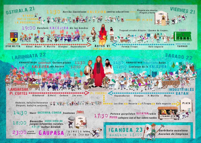 Goizean eta arratsaldean kalejira eginen dute auzoko kaleetan barrena. Arratsaldekoan, mozorro lehiaketa ere eginen dute.