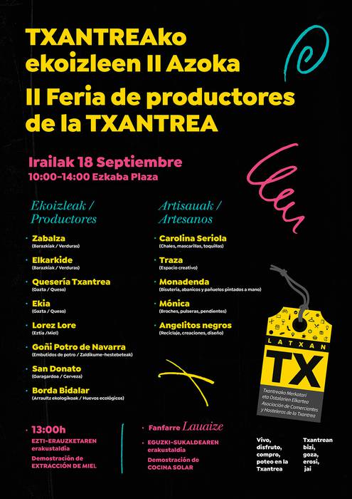 Iruñean nekazaritzako zein abeltzaintzako ustiategiak mantentzen dituen auzo bakarra da Txantrea, eta ekoizle horietako batzuk bihar larunbatean haien produktuak eskainiko dituzte TXANTREAKO EKOIZLEEN II. AZOKAn. Ezkaba Plazan, izanen da hitzordua 10:00etatik 14:00etara, Txantreako Merkatari eta Ostalarien Elkarteak antolatuta.
