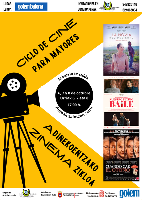 Golem Baiona zinematokietan urriaren 6an, 7an eta 8an aukera izanen da Iruñeko Donibaneko Adinekoen Aldeko Akordioak antolatutako zinema zikloa ikusteko. "Bereziki adineko jendeari interesekoak zaizkion gaiak landuko ditugu hiru pelikulen bitartez", azaldu du Maite Velascok Donibaneko Adinekoen Aldeko Akordioko kideak. "Bizi proiektua aldatzen joaten denean geure burua nola ikusten dugun, seme-alaba eta billobekin ditugun harremanak, dolua, edadismoa... izanen dira hausnarketarako gaiak, adibidez", azaldu du. Gonbidapenak dohainik dira eta bi har ditzake pertsona bakoitzak. Donibane auzoko San Alberto Magno 8an dute egoitza eta bertan eskura daitezke, baita Golem Baiona zinematokietako txarteldegian ere egunean bertan 16:30etatik aurrea. Maite Velascorekin Euskalerria Irratian egindako elkarrizketa argazkian klik eginda entzun daiteke.