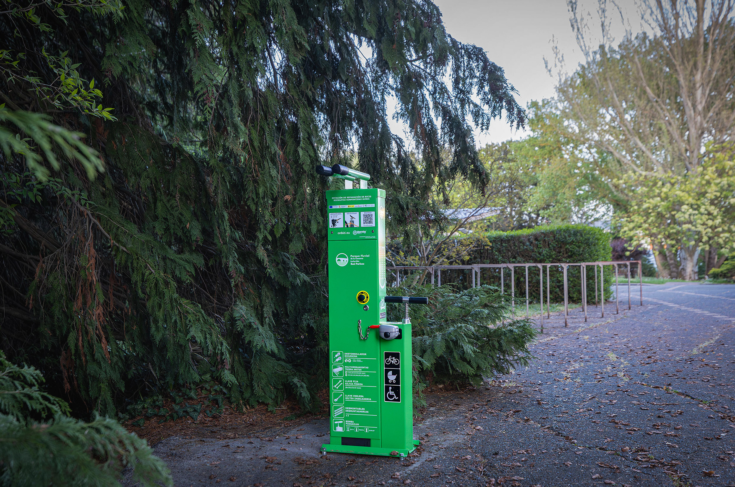 Konponketa-gune bakoitza kolore berdean identifikatuta dago, eta Scandic eredukoa da, OnBizi enpresarena. Puzteko ponpa bat du, zuloak konpontzeko tresnak (bihurkinak eta formatu desberdineko giltzak) eta euskarria, bizikleta jartzeko. Hala, estazio bakoitza tresnak lapurtzetik babesteko helburuarekin, irekitzea desblokeatzeko txanpon bat sartu beharko da, erosketetarako orgen sistema antzeko batean. Gero, konponketa amaitutakoan, txanpona berreskuratuko da.