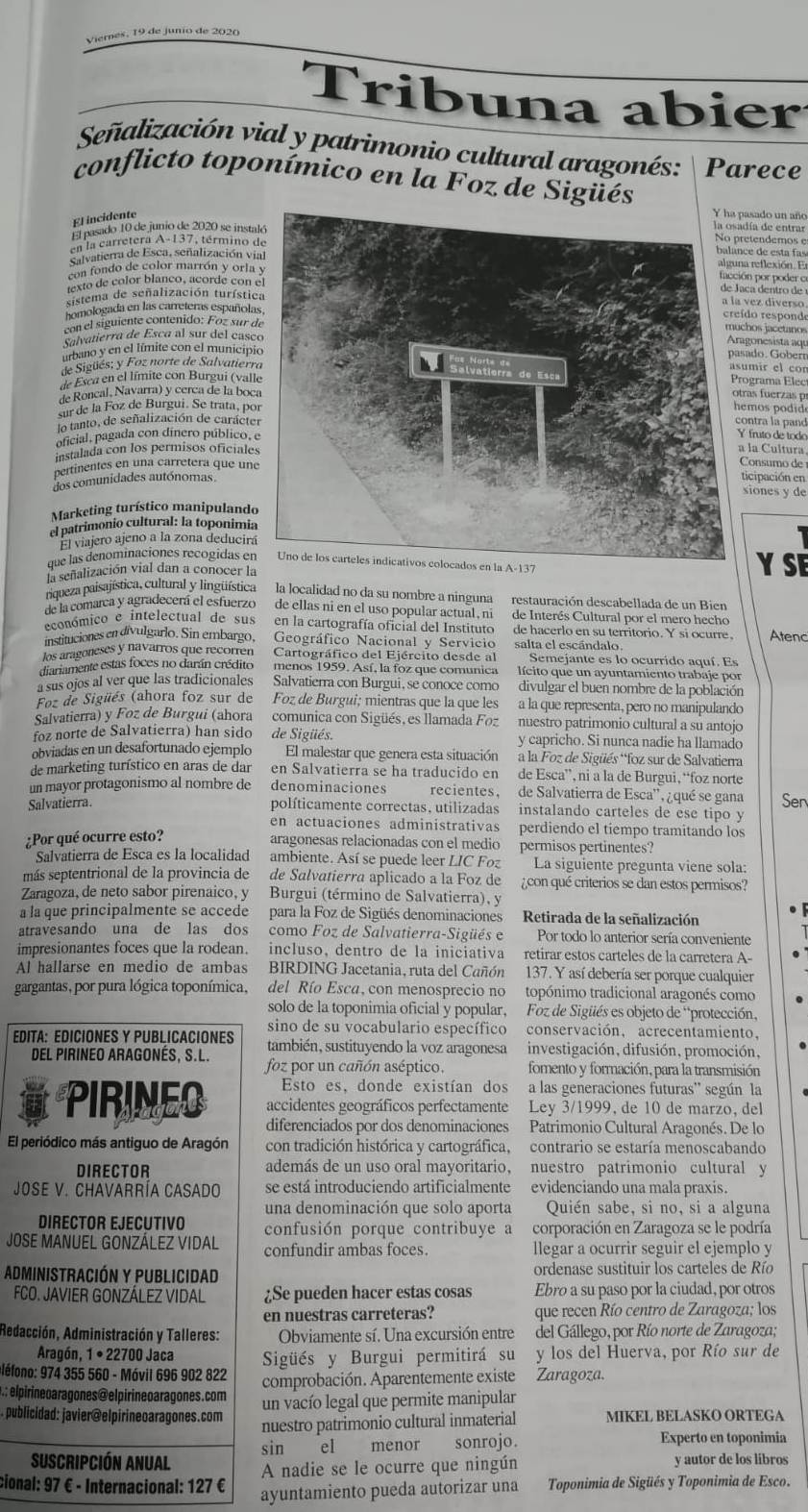 Señalización vial y patrimonio cultural aragonés: conflicto toponímico en la Foz de Sigüés.