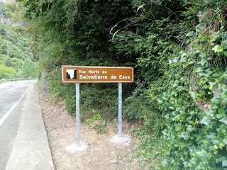 Foz norte de Salvatierra de Esca en el límite con Burgui (valle de Roncal, Navarra) y cerca de la boca sur de la Foz de Burgui. Se trata, por lo tanto, de señalización de carácter oficial, pagada con dinero público, e instalada con los permisos oficiales pertinentes en una carretera que une dos comunidades autónomas.