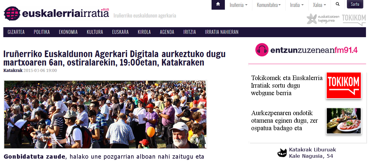 Iruñerriko Euskaldunon Agerkaria sortu dute Tokikomek eta Euskalerria Irratiak elkarlanean. Informazio lokala jorratuko duen eta komunitateari tarte zabala eskainiko dion webgunea izanen da, independentea, irekia, parte hartzailea. Ostiralean, 19:00etan, horren aurkezpena eginen dute. Eta hain justu komunitateko kideak, lagunak, alboan nahi dituzte.