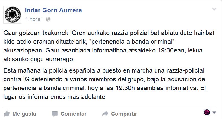 Euren Facebook orriaren bidez eman dute gertatutakoaren berri: "Gaur goizean txakurrek Indar Gorriren aurkako razzia-polizial bat abiatu dute hainbat kide atxilo eraman dituztelarik, "banda kriminaleko kide" akusaziopean. Gaur asanblada informatiboa atsaldeko 19:30ean, lekua abisatuko dugu aurrerago"