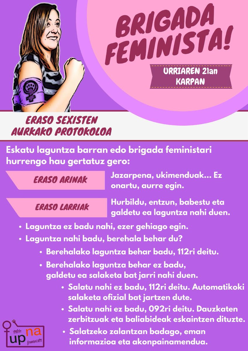 "Eraso matxista bat pairatu edo laguntza feminista behar izanez gero, zinta more feminista bilatu". Hala dio brigada feministak iragartzeko afixak.