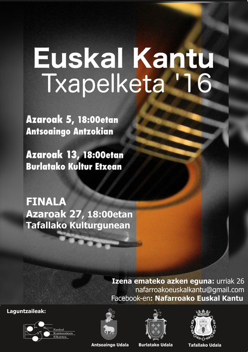 Nafarroako Euskal Kantu Txapelketa berrabiaraztea erabaki du kantuzale talde batek. Azken zazpi urteotan krisia eta sostenguen faltaren eraginez txapelketa ez da jokatu Nafarroan. Aurten, aldiz, zenbait kantari elkartu dira Kantuzaleen Elkarteari haize eta bizia berriz emateko. Horrela hiru saio antolatu dituzte Antsoain, Burlata eta Tafallako udalekin batera. Haietan Nafarroa osotik etorritako talde, bikote eta bakarlariak arituko dira, kantu zahar zein berriak eskainiz.