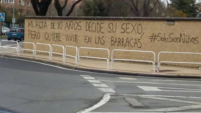 "Nire semeak bere sexua erabakitzen du, baina superman izan nahi du" eta "Nire 10 urteko alabak bere sexua erabakitzen du, baina barraketan bizi nahi du" pintaketak azaldu dira Iruñerrian, Chysallis elkarteak egindako haurren transexualitatearen inguruko kontzientziazio kanpainari eraso eginez. Markesinaren batean, "Kanpora!" hitza ere margotu dute eta genitalen izenak esprai gorriz ezabatu dituzte.