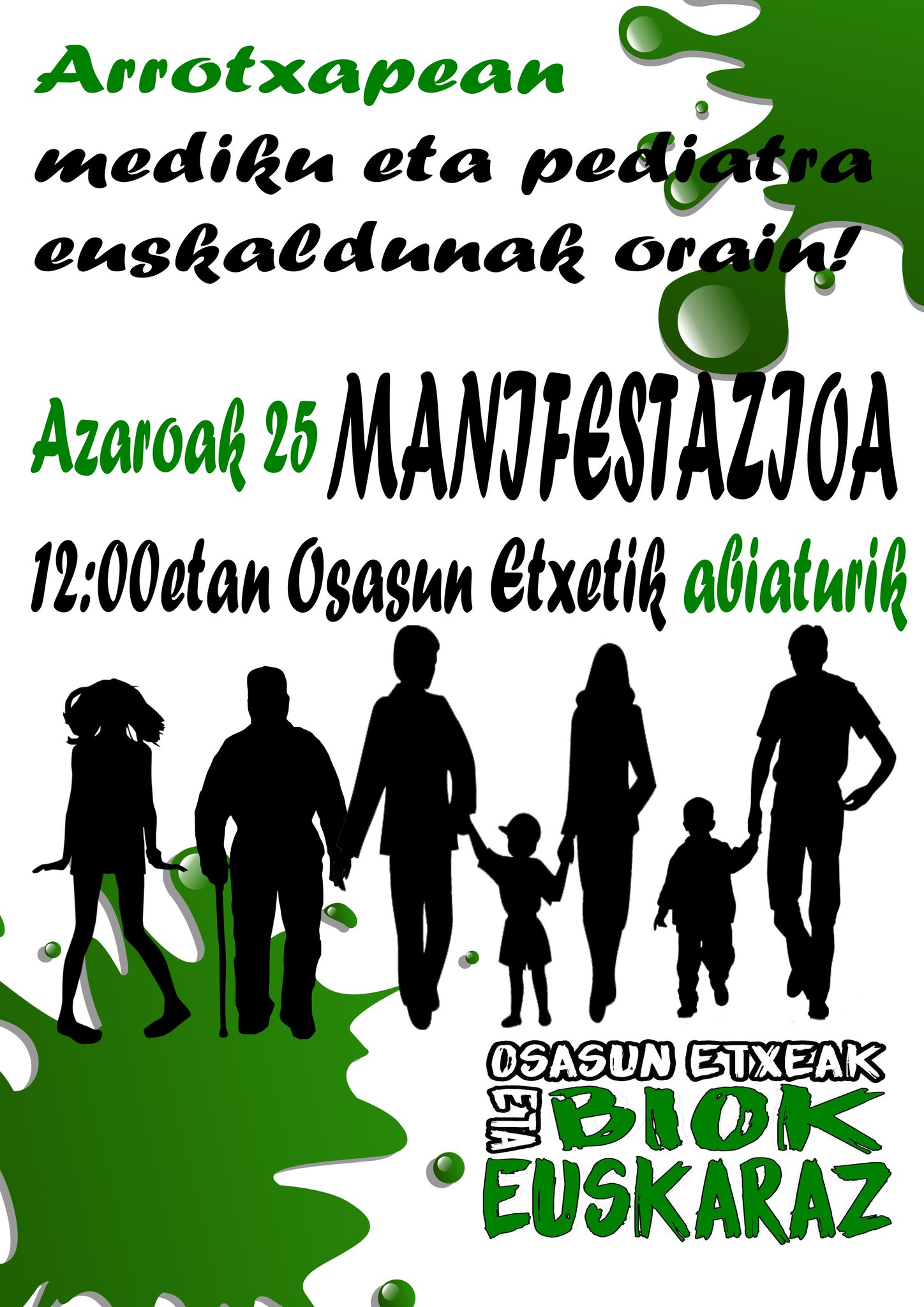 Osasunbidean kexak aurkeztu; osasun-etxea okupatu; Osasun Kontseilariarekin eta Euskarabideako zuzendariarekin bildu; jende-katea osasun etxea inguratuz; sinadura bilketa... Asko dira Arrotxapeako osasun etxean mediku eta pediatra euskaldunak exijitzeko 'Osasun Etxeak eta biok euskaraz' plataformak egindako ekimenak. Orain, urrats bat gehiago eginen dute: manifestaziora deitu dute, azaroaren 25ean, larunbatarekin.