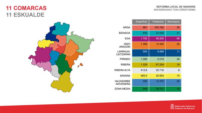 Honako hauek izango dira eskualdeak: Arga, Bidasoa, Ega, Irati-Aragoi, Larraun-Leitzaran, Pirinioa, Erribera, Erriberagoitia, Sakana, Izarbeibar eta Erdi Aldea. Hirutan, era berean, azpieskualdeak sortzeko aukera eman nahi du gobernuak —Argaren kasuan, Iruñerriaren eta ibarraren artean; Irati Aragoiren kasuan, Zangoza eta Pirinioaurrearen artean; eta Egan, Jurramendi eta Lizarra aldeko Erriberaren artean—. Era berean, egitura hori moldatu daiteke. Kasurako, Erribera hartuko duen eskualdea sortzea proposatu diete, ondoren bi azpieskualdetan banatzeko.