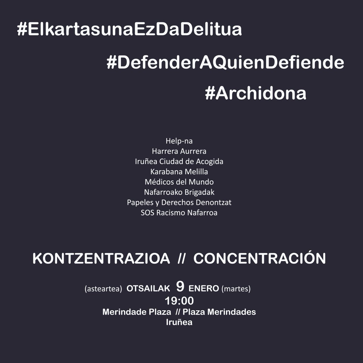 Horregatik, Elkartasuna ez da delitua lelopean, kexa bat aurkeztu zuten Nafarroako hainbat herri eragilek Espainiako Gobernu Delegaritzaren aurrean, orain bi aste -Harrera Aurrera, Iruñea Harrera Hiria, Munduko Medikuak, SOS Arrazakeria, Paperak Denontzat, Help-na, Melillako Karabana eta Nafarroako Brigada taldeek-. Gainera, elkarretaratzera deitu dute, urtarrilaren 9an, alegia bihar, 19:00etan, Merindade plazan.