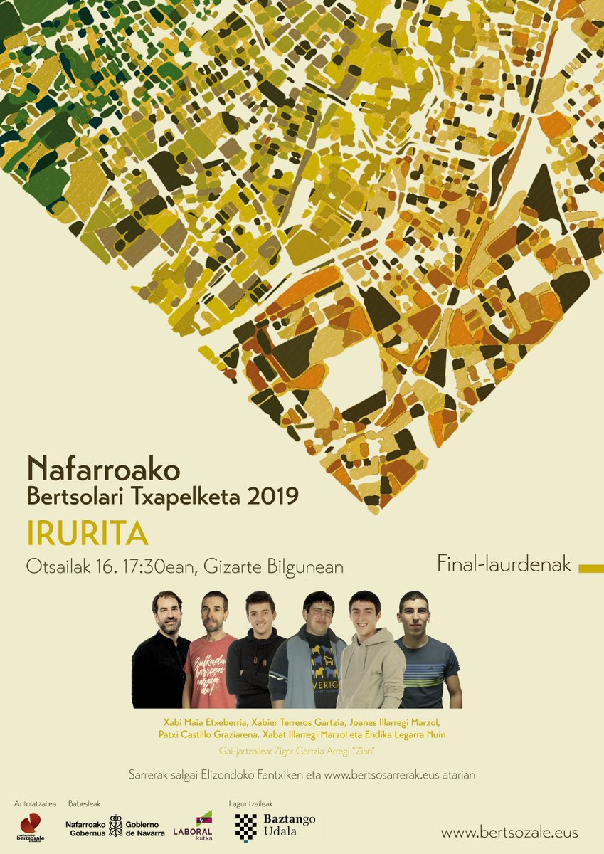 Larunbatean, Iruritan, ondoko sei bertsolari hauek izango dira oholtza gainean: Xabi Maia, Xabier Terreros, Joanes Illarregi, Patxi Castillo, Xabat Illarregi eta Endika Legarra. Azken bi hauek lehen aldiz hartuko dute parte txapelketa batean, aurre-kanporaketetan sailkatu ostean. Zigor Gartzia “Zian” ariko da gai-jartzaile lanetan. 17:30ean abiatuko da saioa, Iruritako Gizarte Bilgunean. Nafarroako Bertsozale Elkarteak Baztango Udalaren laguntzarekin antolatu du saioa.