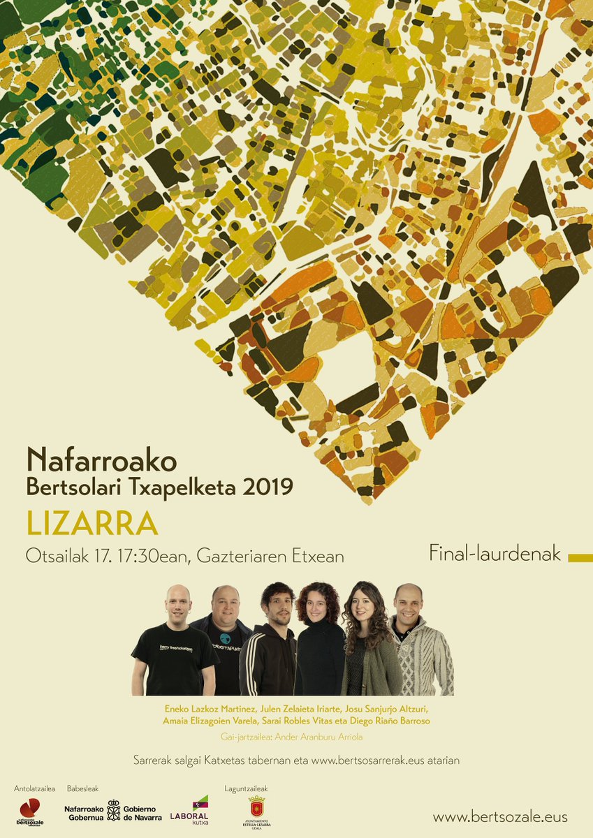 Igandean izango da laugarren eta azken final-laurdena, Lizarran. Taula gainean izango dira Eneko Lazkoz, Julen Zelaieta, Josu Sanjurjo, Amaia Elizagoien, Sarai Robles eta Diego Riaño bertsolariak. Ander Aranburu izango da gai-jartzailea. 17:30ean emango zaio hasiera, Lizarrako Gazteriaren Etxean. Lizarrako Udala da saioan laguntzaile.