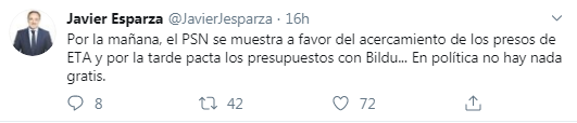 Esparzaren ustez, Foru Gobernuak aurkeztutako proiektuak "aurreko legealdian lau alderdiek egin dituzten politika guztiak berresten ditu". "Aurrekontu hauek Uxue Barkosek eta Adolfo Araizek aurkez zitzaketen, eta inork ez gintuen faltan botako", gaineratu du.