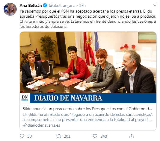 Ana Beltran Alderdi Popularreko Antolakuntza idazkariorde eta Nafarroako PPko presidenteak PSNri, eta, zehazki, Maria Txibite Nafarroako Gobernuko presidenteari, leporatu dio "gezurra esatea" eta EH Bildurekin foru erkidegoko aurrekontuak negoziatzea, ETAko presoak Euskaditik gertu dauden kartzeletara "hurbiltzearen" truke.