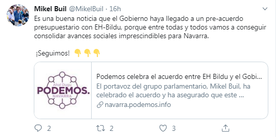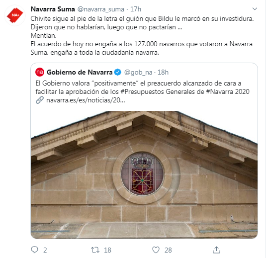 EH Bildu eta Nafarroako Gobernuak lortutako aurreakordioa jakin eta berehala iritsi ziren atzo lehenengo erreakzioak. Twitter sare soziala erabili dute nafar ordezkari politiko askok horretarako, bai Nafarroan eta baita Madrilen ere.