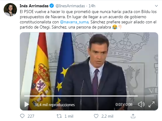 Ines Arrimadas Ciudadanosek Kongresuan duen bozeramaileak "Otegiren alderdiarekin aliatuta jarraitzea" leporatu dio PSOEri. "Inoiz egingo ez zuela agindu zuena egin du berriro", esan du. Ciudadanoseko bozeramaileak bideo bat argitaratu du Pedro Sanchezen hitzaldi publiko batekin, eta bertan esaten zuen ez zuela itunik egingo alderdi horrekin: "PSNk eta PSOEk jarrera bera dugu, Bildurekin ez dugu ezer adostuko".