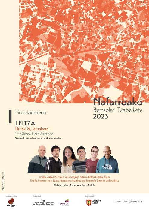 Leitzako herri aretoan egingo dute Nafarroako Bertsolari Txapelketa final-laurdena, arratsaldeko 17:30ean. Eneko Lazkoz Martinez, Josu Sanjurjo Alzuri, Bittori Elizalde Soto, Endika Legarra Nuin, Saats Karasatorre Martinez eta Fernando Ziganda Urdanpilleta izango dira parte hartzaileak; gai-jartzailea Ander Aranburu Arriola.