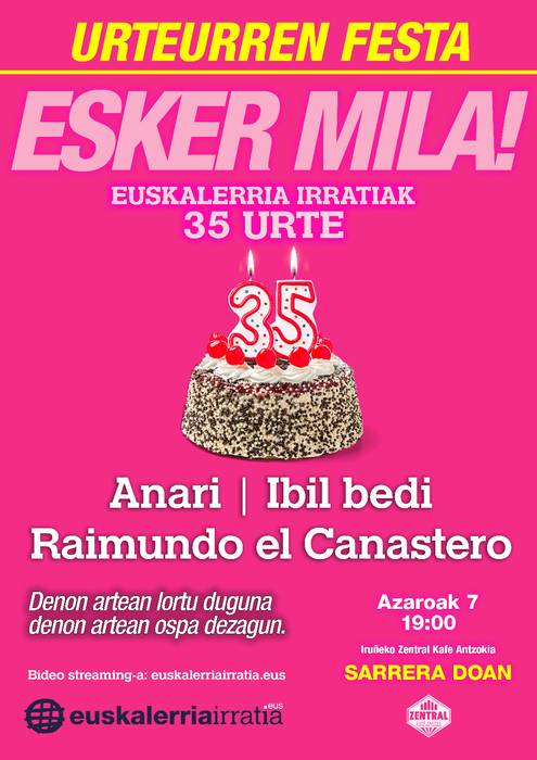 Euskalerria Irratiak 35 urte eginen ditu azaroaren 7an, asteartearekin. Urteurrena ospatzeko, egun horretan berean, 19:00etan, festa eginen dute Iruñeko Zentral Kafe Antzokian. Ekitaldiak musika eta hitza uztartuko ditu.