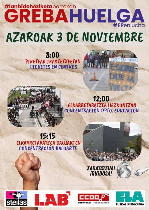 Goizeko zortzietan hasi dira ikastetxe zenbaitetan informazio piketeak egiten eta atarian elkarretaratzea egiten. Kexu dira Hezkuntza Departamentuak Lanbide Heziketako zentroekin hartu duten jarrerarekin. Murrizketak aplikatu dizkiela salatzen ari dira. Izan ere, joan den ikasturtearen amaieran jakinarazi zuen Carlos Gimenok aurten ikasle guztiek izanen zutela harreman zuzena enpresekin praktiken bidez. Horrek lan zama handitzea dakar. Irakasleek denbora gehiago beharko dute kudeaketa lanetarako eta ikasleari zuzeneko arreta eskaintzeko baina baliabideak ez dizkiela eskaini kritikatzen ari dira. Hezkuntza komunitate osoa informatua egon dadin goizez afixak banatu dituzte, eguerdian elkarretaratzea eginen dute hezkuntza departamentuaren aitzinean eta 15:15ean elkarretaratze zaratatsurako dei egin dute Baluarteko plazan.